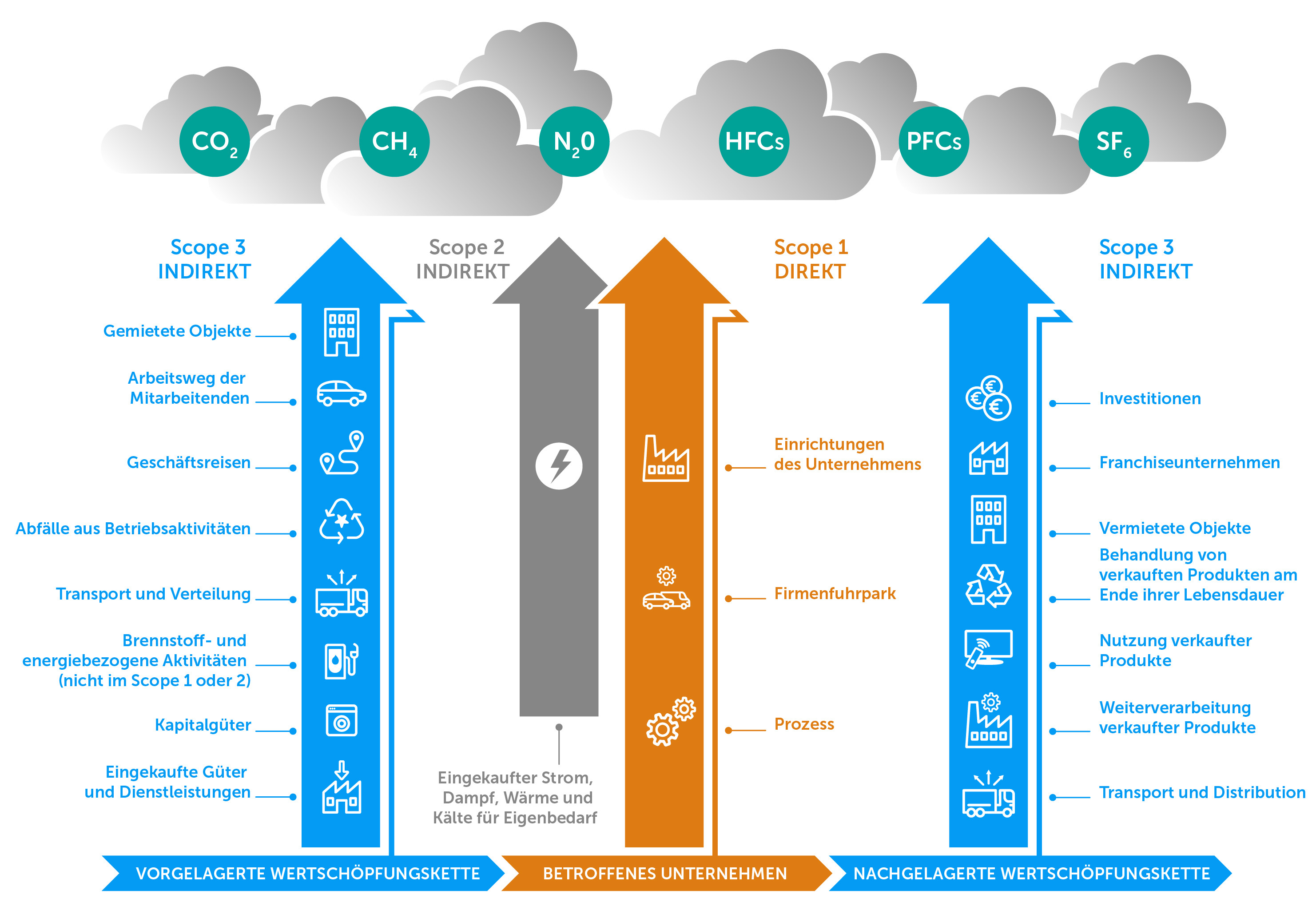 Rechts wird die nachgelagerte Wertschöpfungskette durch einen weiteren blauen Pfeil dargestellt, der Scope 3 (indirekte Emissionen) entspricht. Dazu zählen: Investitionen, Franchiseunternehmen, vermietete Objekte, Behandlung von verkauften Produkten am Ende ihrer Lebensdauer, Nutzung verkaufter Produkte, Weiterverarbeitung verkaufter Produkte sowie Transport und Distribution.