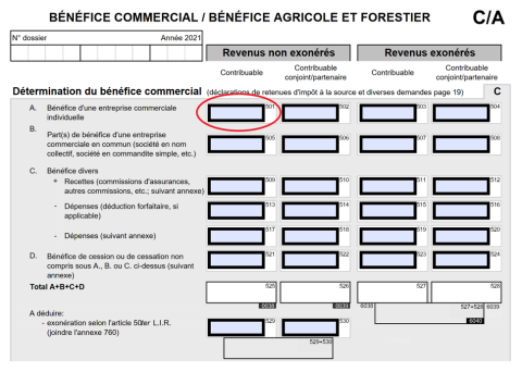 The realized business profit is entered in box 501 of the Income Tax Return (Déclaration pour l’impôt sur le revenu Form 100) under the heading "business profit" (page 5).