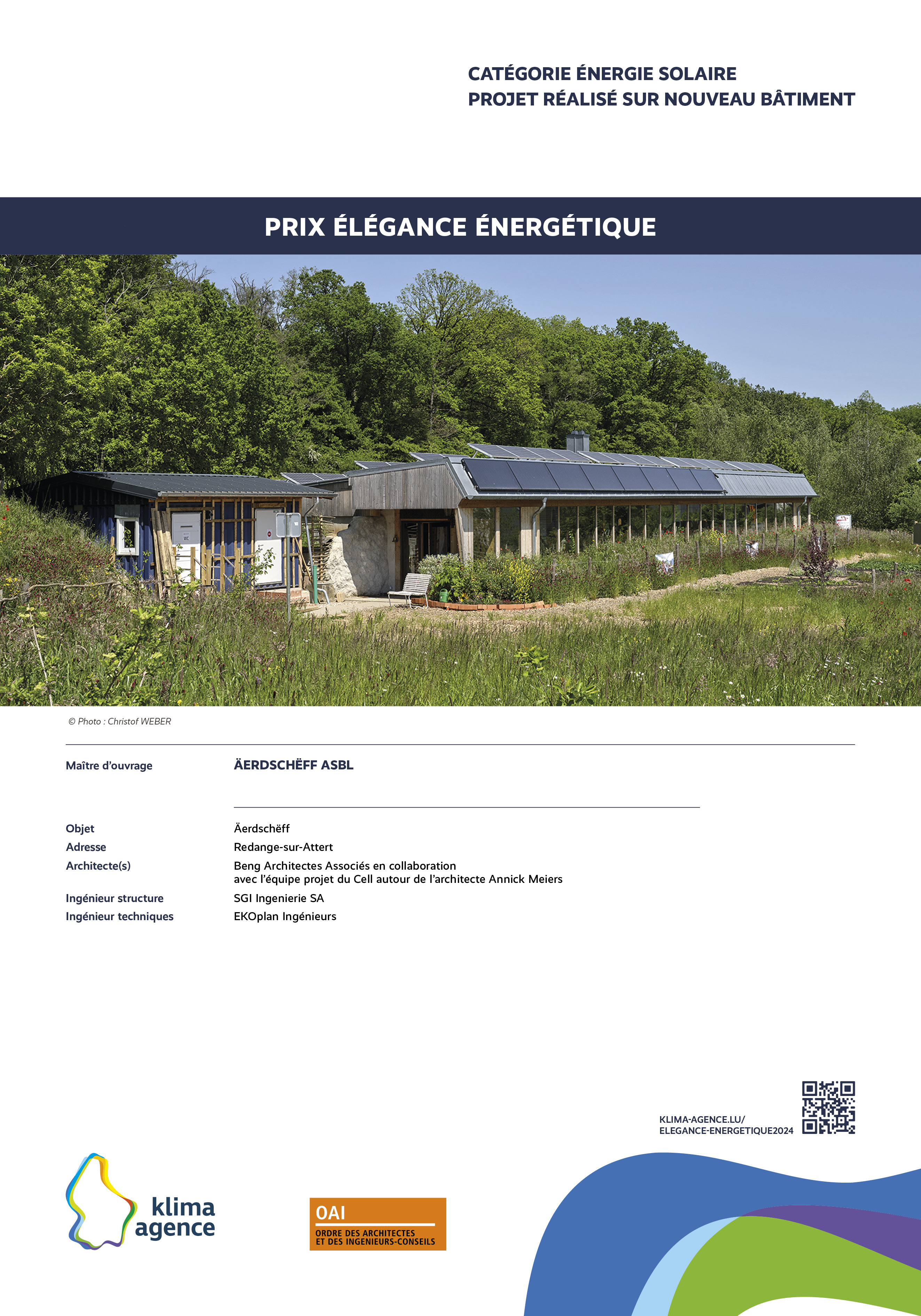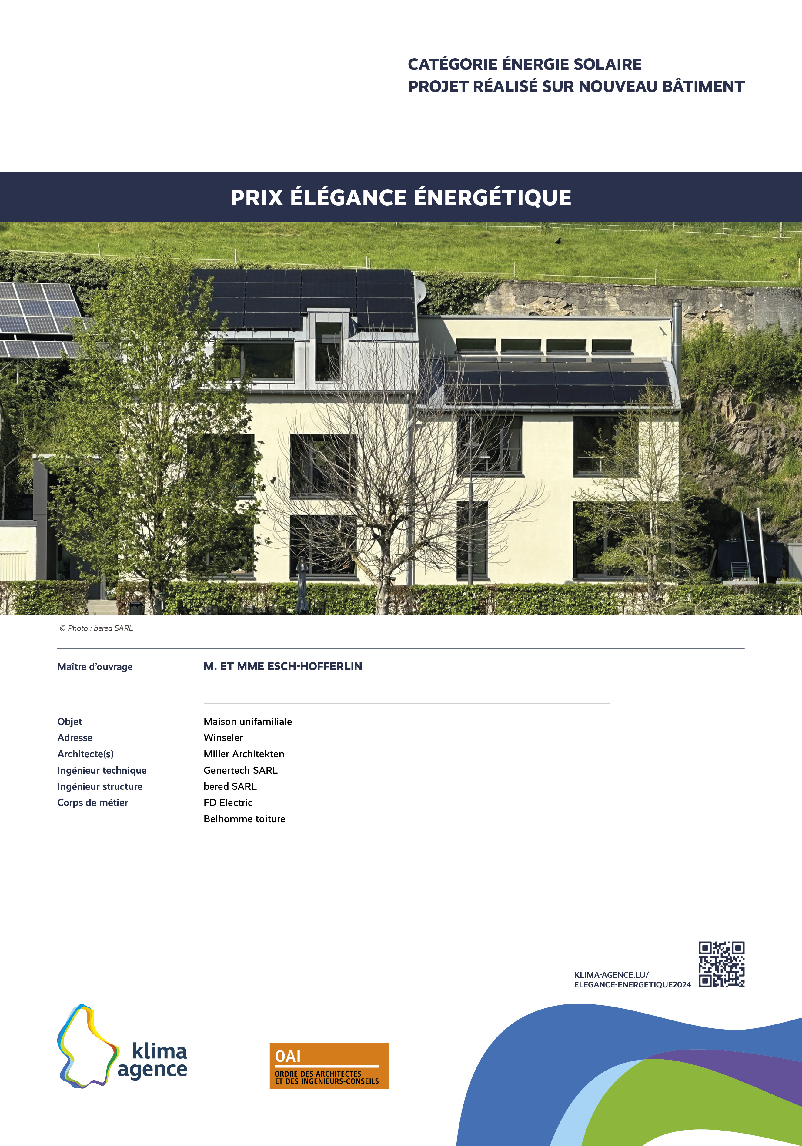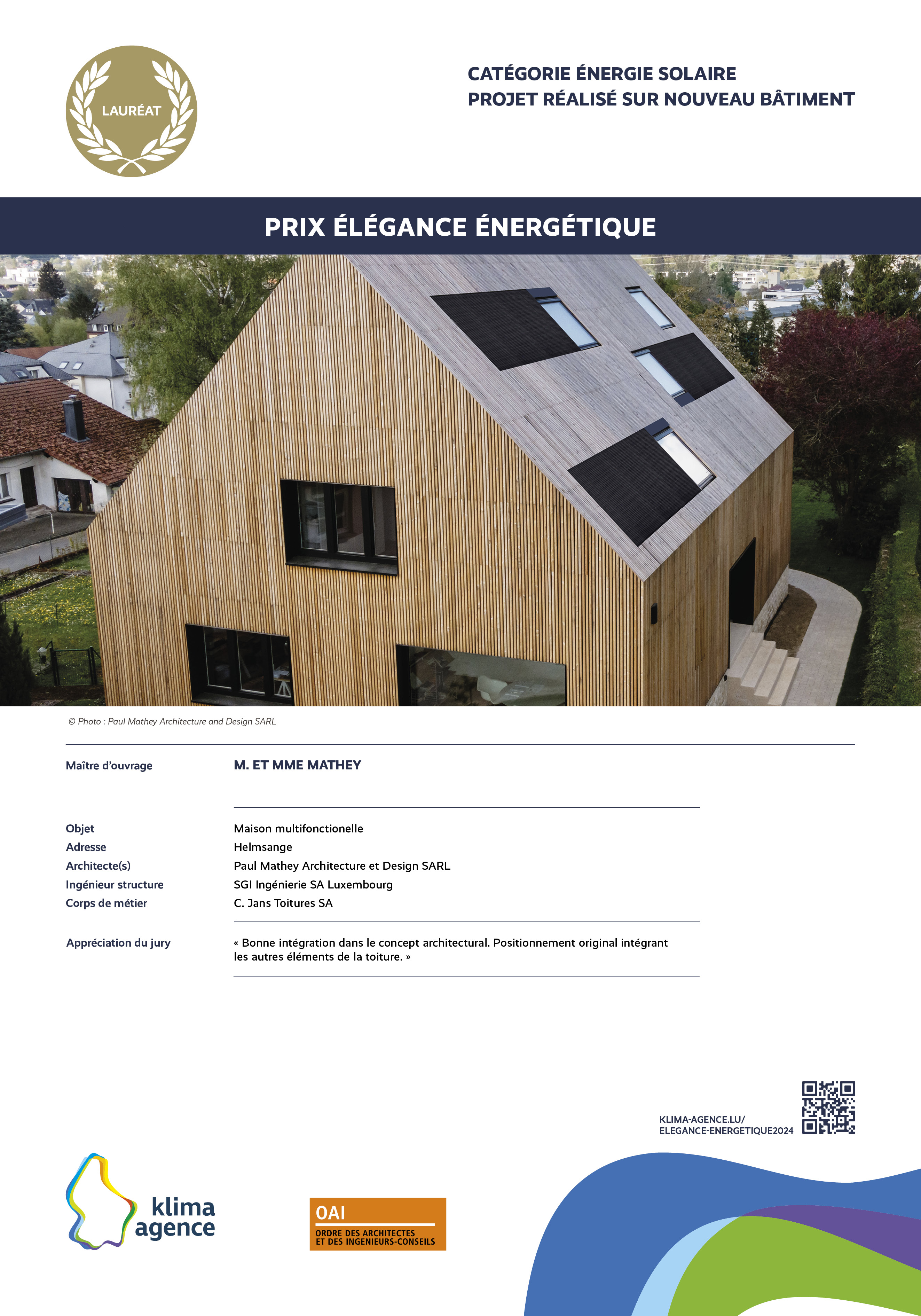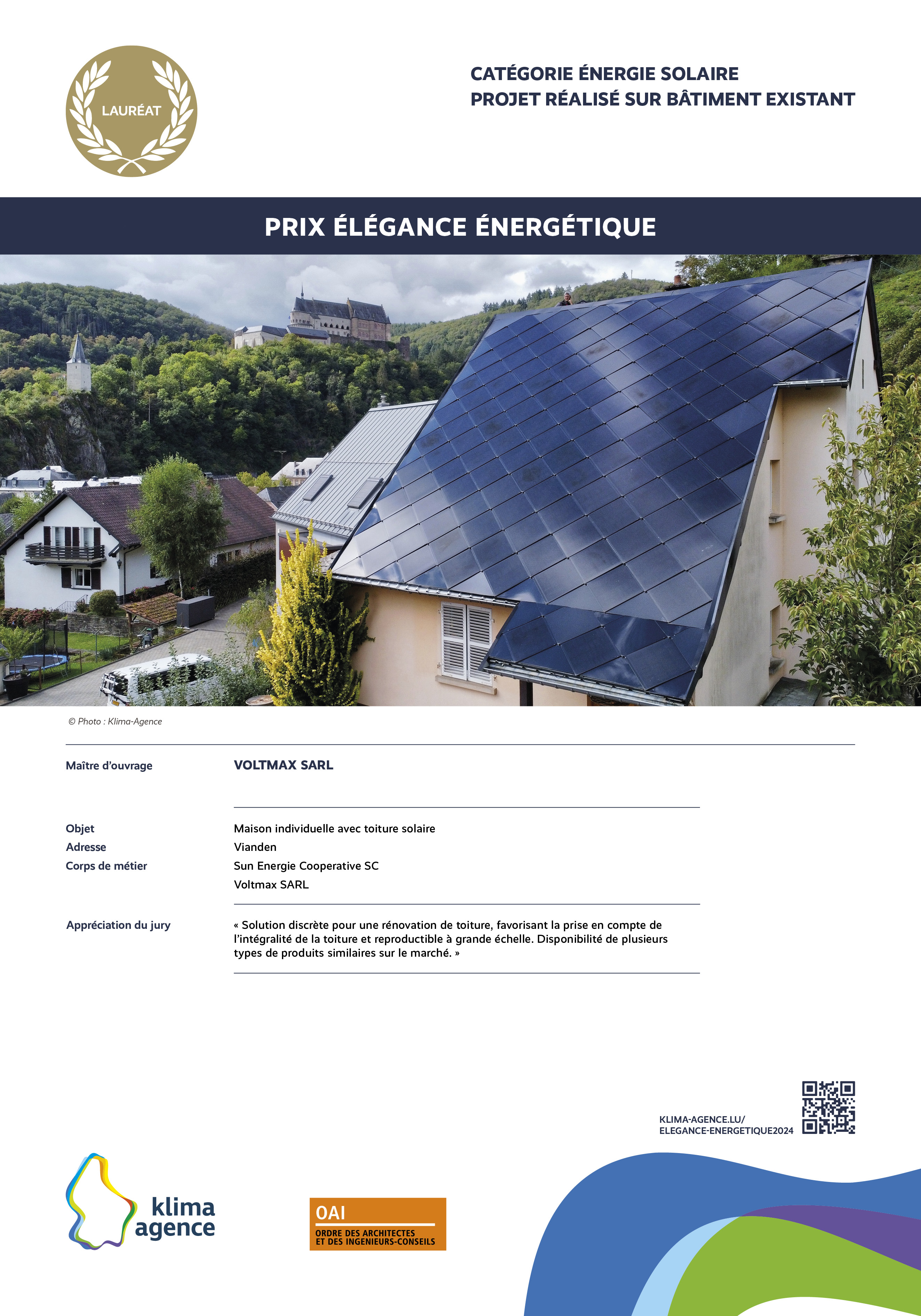 Le Prix Élégance énergétique, organisé par Klima-Agence en collaboration avec l'OAI vise à récompenser des propositions d'intégrations architecturales remarquables et visibles de l'extérieur pour des installations photovoltaïques, solaires, pompes à chaleur, bornes de charge et systèmes de ventilation. L'esthétique sera un critère primordial dans l'évaluation des propositions, soulignant l'importance de l'harmonie entre fonctionnalité et design.