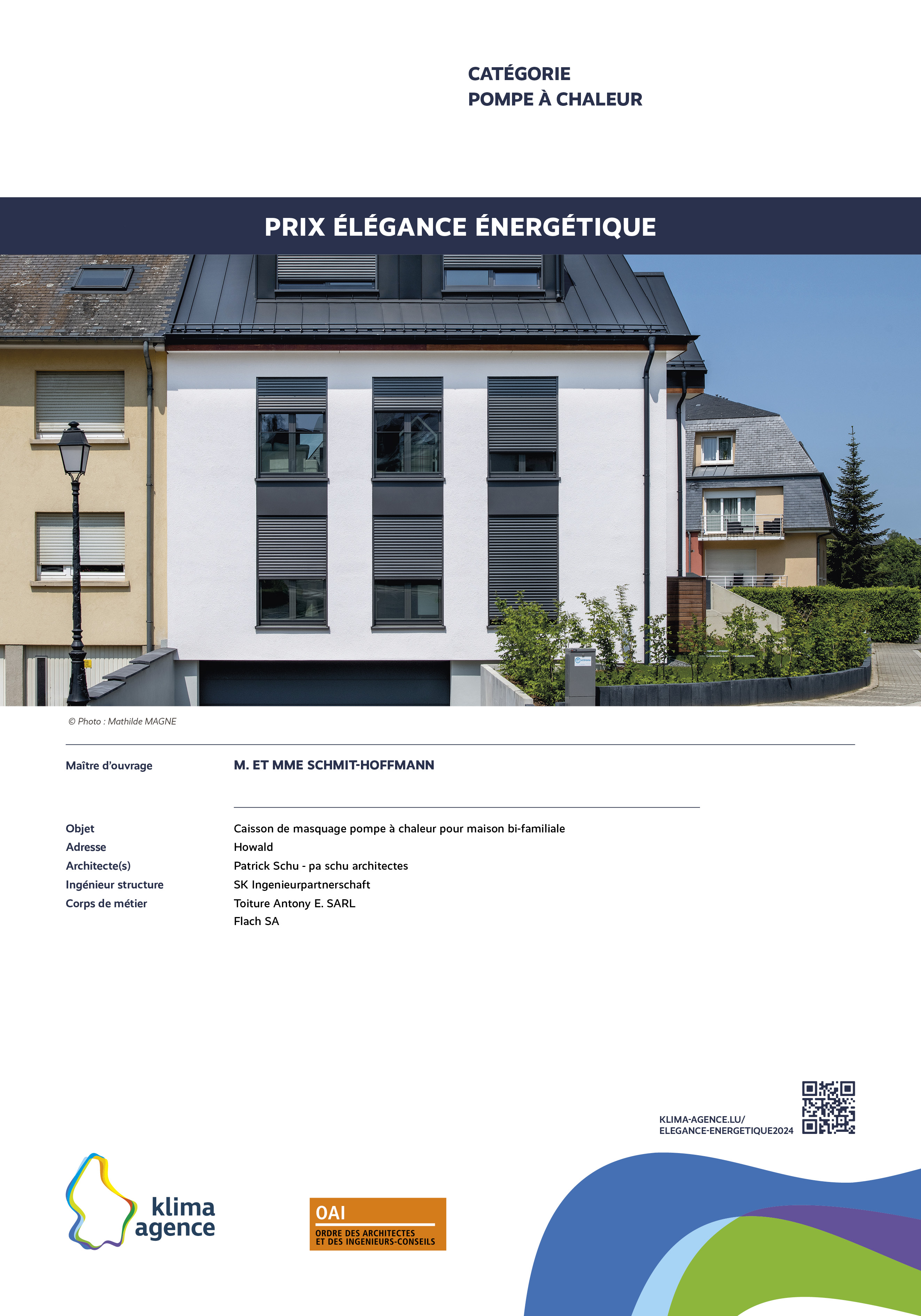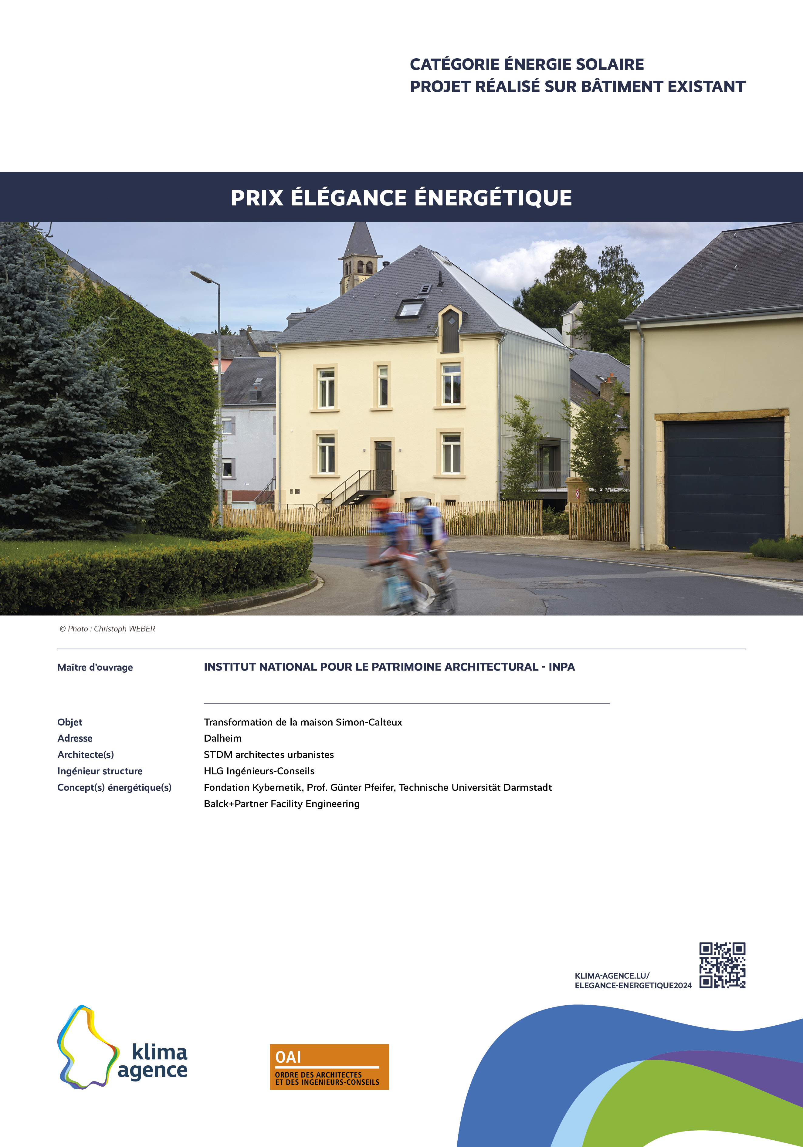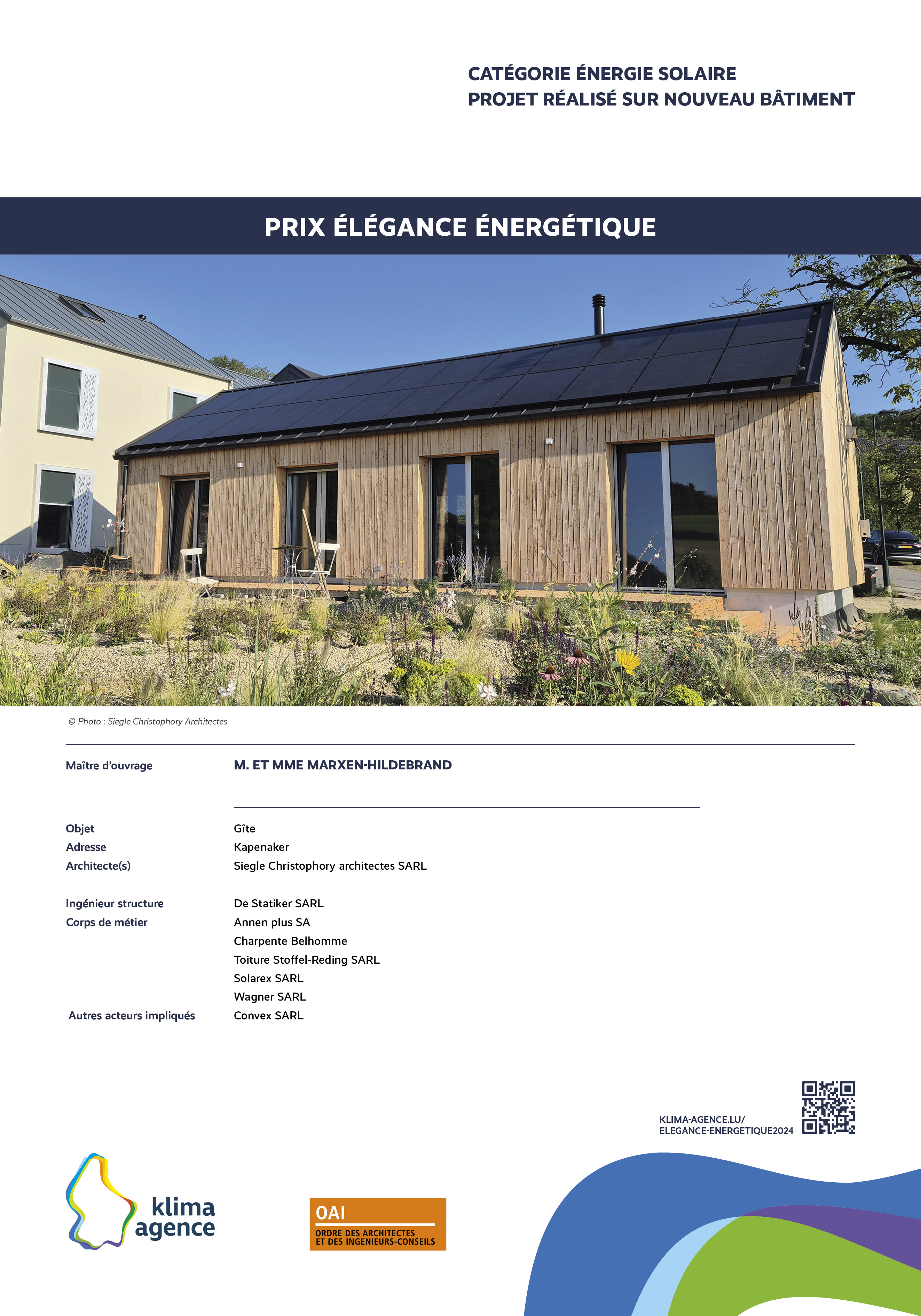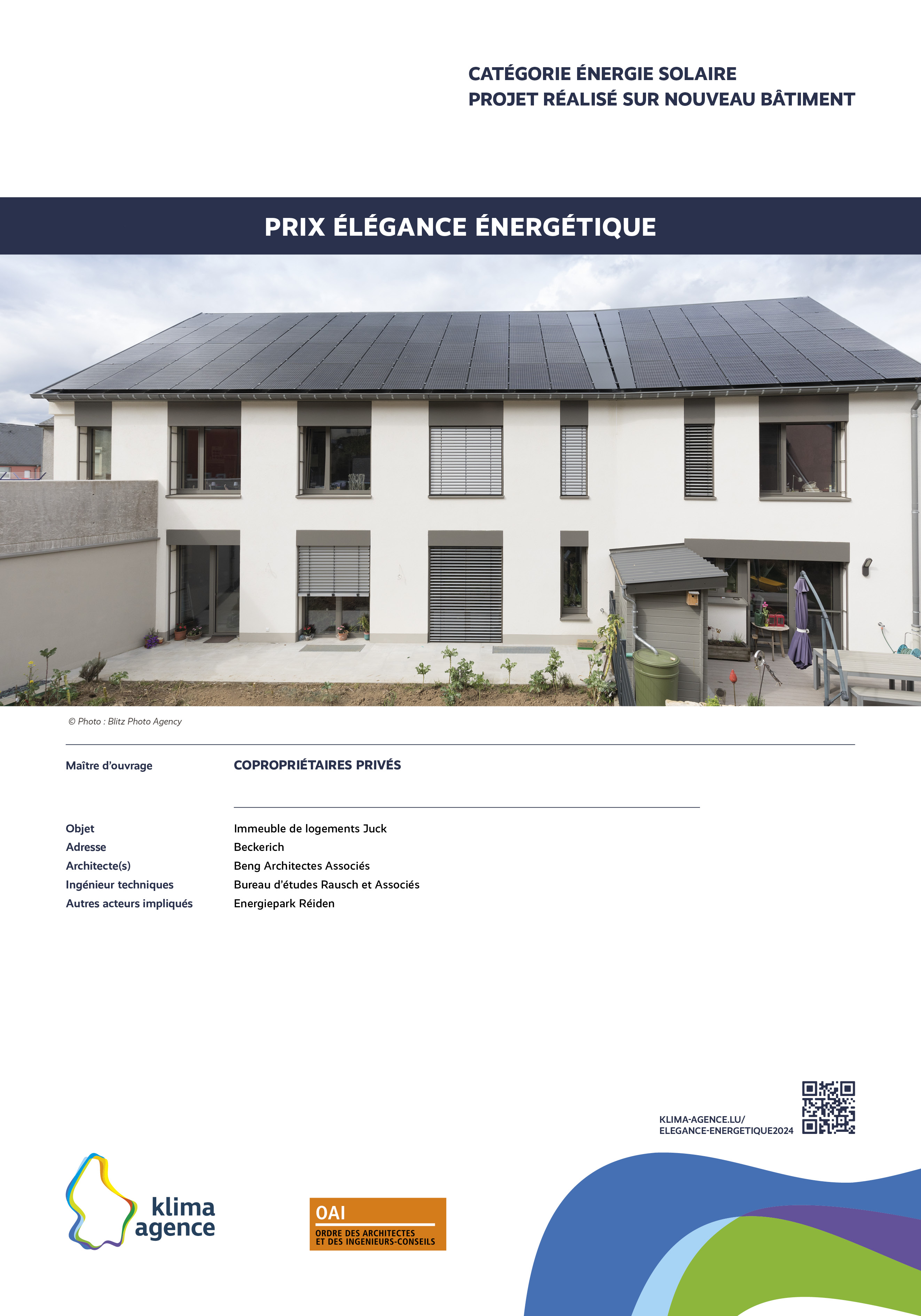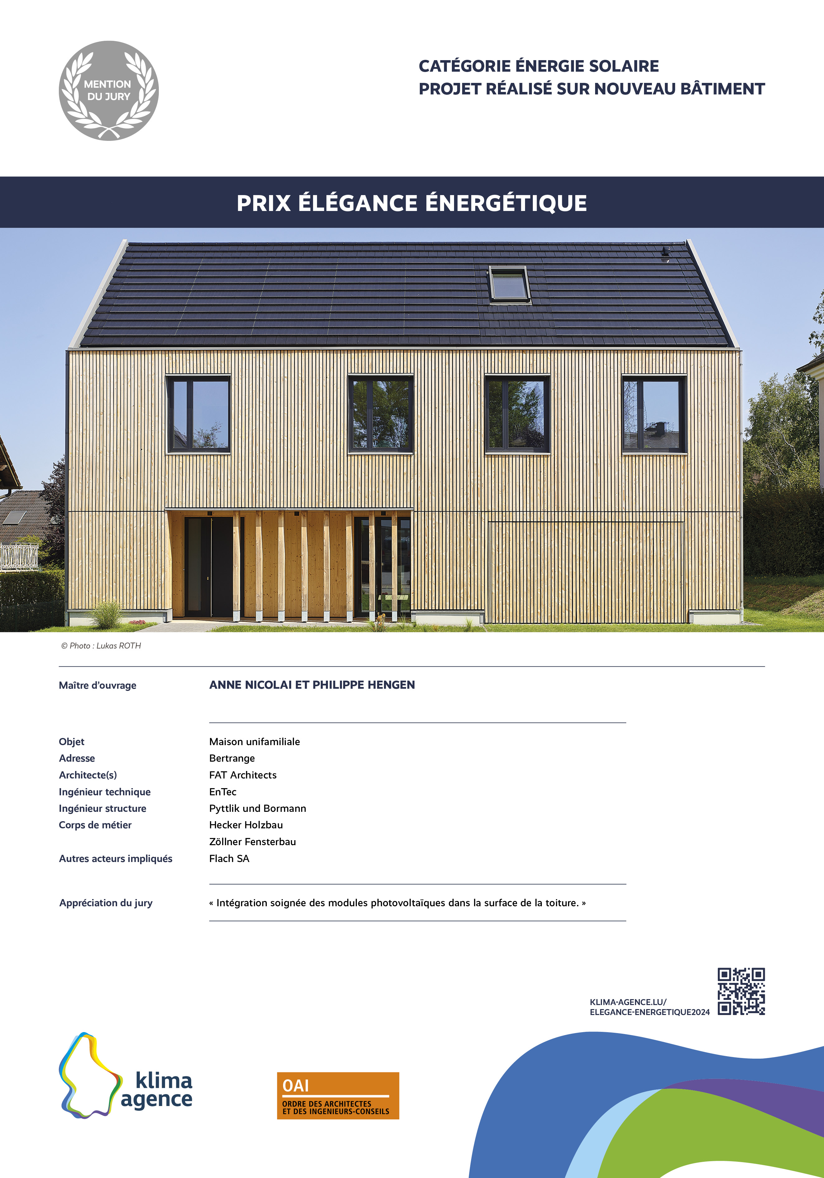 Le Prix Élégance énergétique, organisé par Klima-Agence en collaboration avec l'OAI vise à récompenser des propositions d'intégrations architecturales remarquables et visibles de l'extérieur pour des installations photovoltaïques, solaires, pompes à chaleur, bornes de charge et systèmes de ventilation. L'esthétique sera un critère primordial dans l'évaluation des propositions, soulignant l'importance de l'harmonie entre fonctionnalité et design.